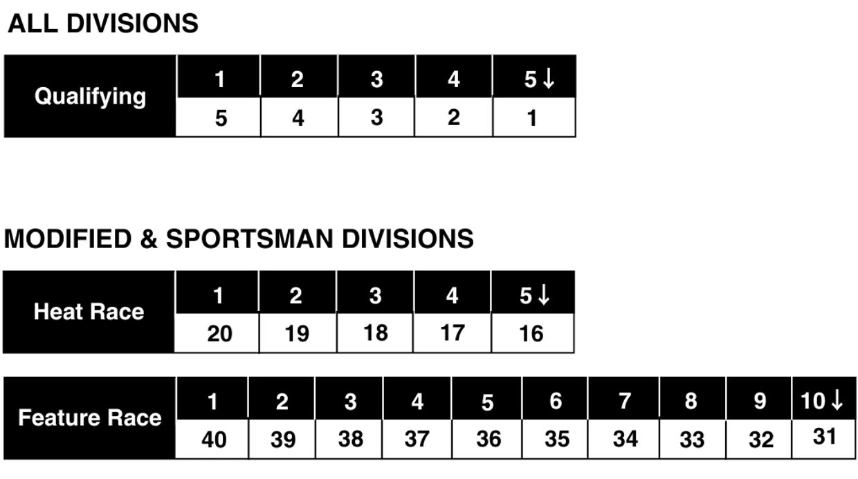 "Start" points will be awarded to any car that enters a race and takes the green flag. "Start" points are the lowest points available in your division. In any event that the track officials feel a driver is abusing "Start" points - "Show" points and/or money may be awarded. If a driver is Disqualified for any reason, ALL points for the night are forfeit.