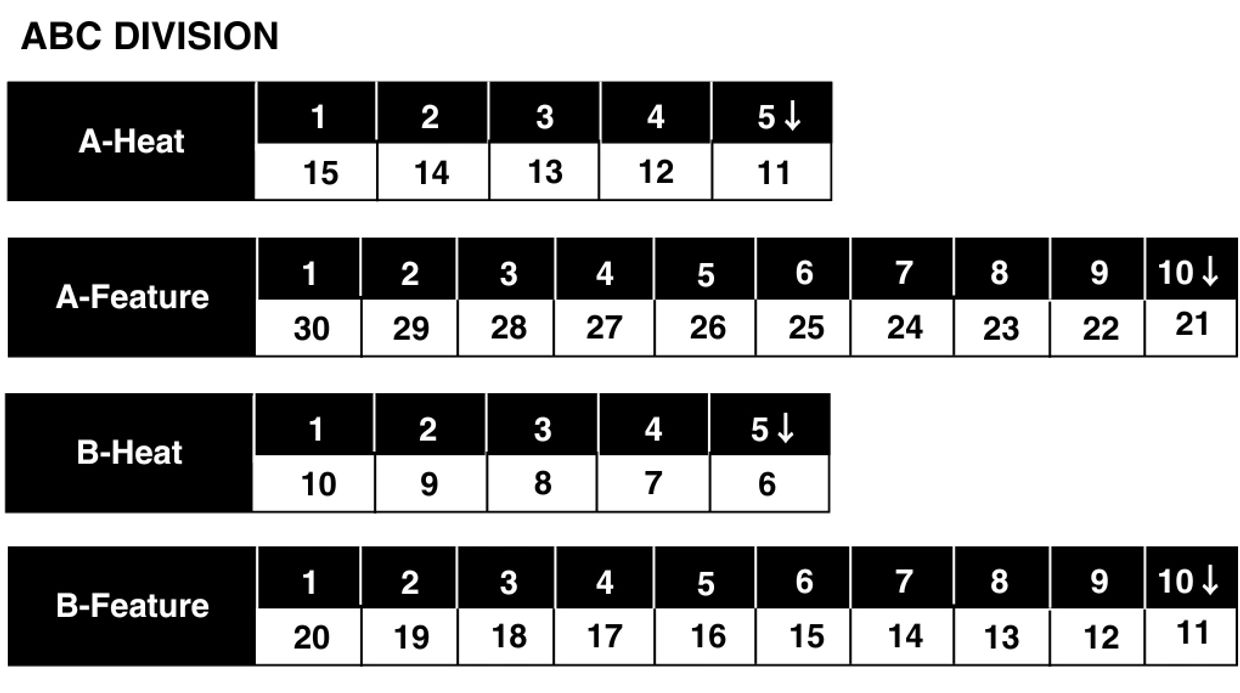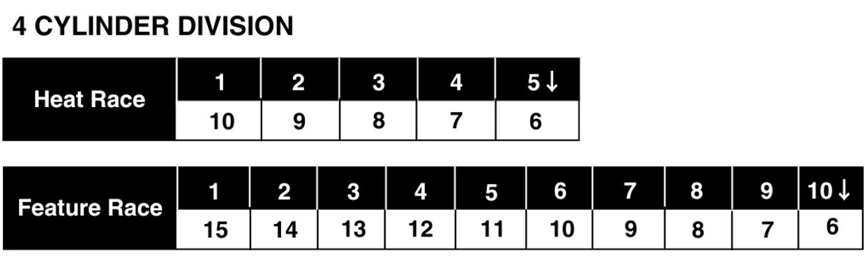 The class a driver is competing in for championship points will be determined based on which class said driver has competed the most events in. For example, if a driver has 5 nights within the "A" division and 2 nights in the "B" division, that driver's points would be placed in the A-Division. In the event a driver has competed in an equal of nights (4 in the "A" Division, 4 in the "B" Division) points would be assigned to the lower qualifying division (B-Division).